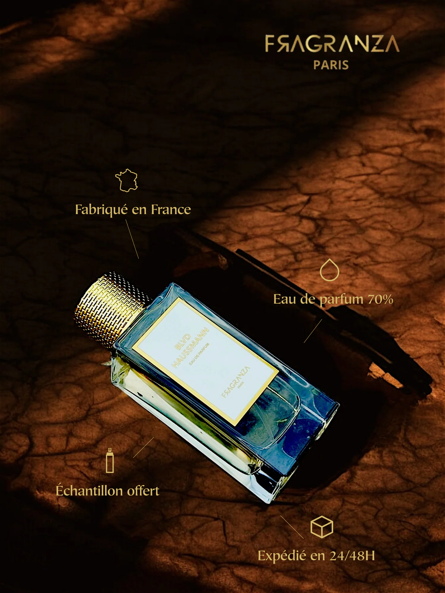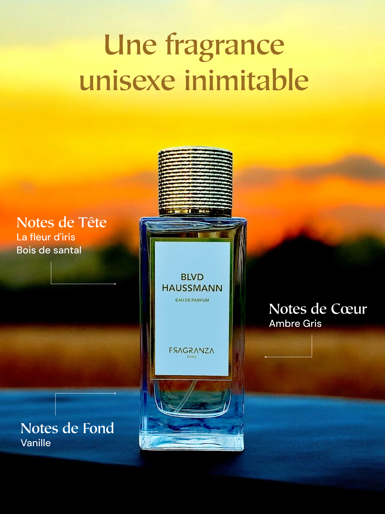 Le parfum Boulevard Haussmann capture l'essence de Paris. La fleur d'iris, délicate, s'entrelace avec le bois de santal, apportant une chaleur réconfortante. L’ambre gris ajoute une touche luxueuse et riche, tandis que la vanille offre une douceur gourmande. Ensemble, ces notes racontent une promenade olfactive au cœur de la Ville Lumière, où chaque souffle est une invitation à l'élégance.